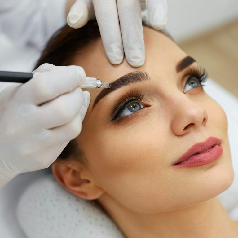 Perfekte Augenbrauen mit Mikropigmentierung für einen natürlichen Look.